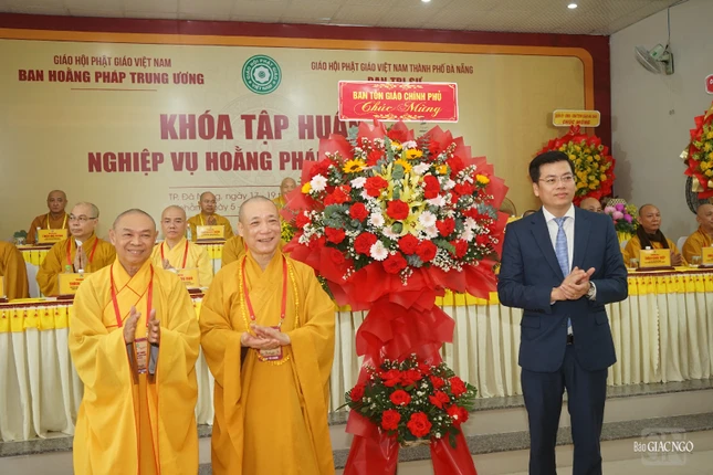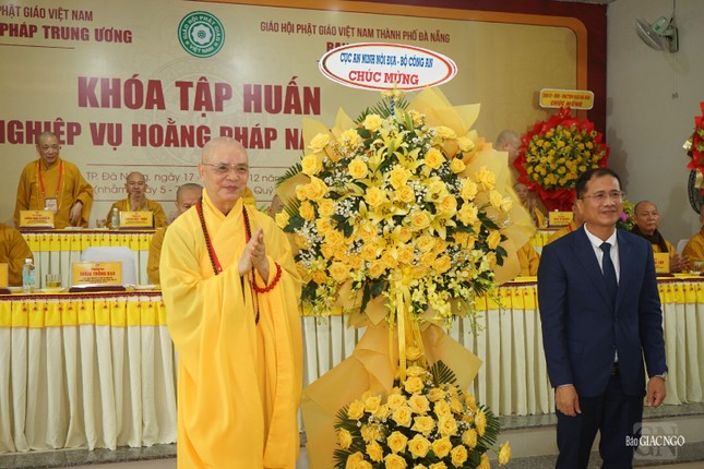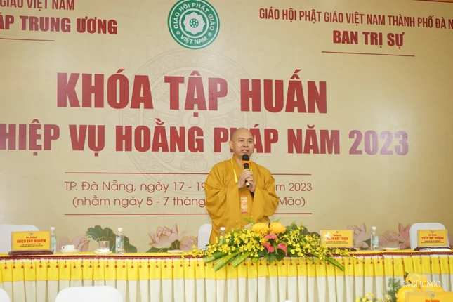 Đại diện chính quyền, ông Ngô Xuân Thắng, Ủy viên Ban thường vụ Thành ủy, Chủ tịch UBMTTQVN TP.Đà Nẵng phát biểu chúc mừng khóa tập huấn nghiệp vụ hoằng pháp năm 2023; ghi nhận định của Tăng Ni, Phật tử TP.Đà Nẵng trong năm với nhiều thành tựu nổi bật.