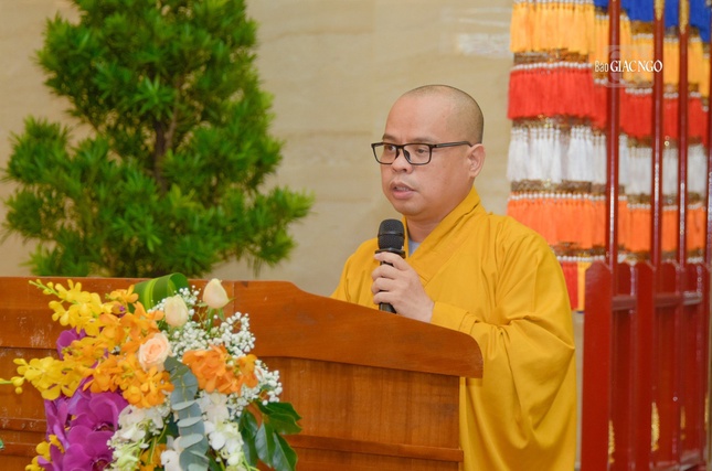 Tại buổi thăm, Thượng tọa Thích Thiện Quý, Phó Trưởng ban Trị sự kiêm Chánh Thư ký Ban Trị sự GHPGVN TP.HCM báo cáo tóm tắt công tác An cư kiết hạ Phật lịch 2567 của Phật giáo Thành phố đến hội chúng.