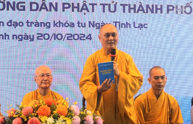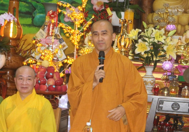 Tại đạo tràng chùa Pháp Tạng, Đại đức trụ trì Thích Trí Huệ phát biểu chào mừng và báo cáo tóm tắt sinh hoạt tu học của đạo tràng.