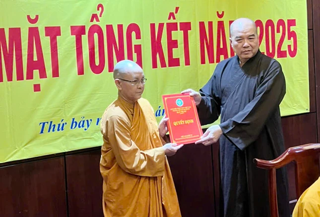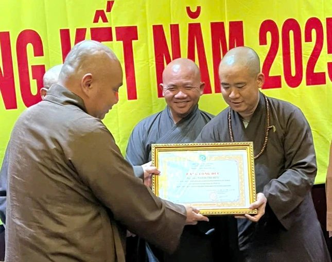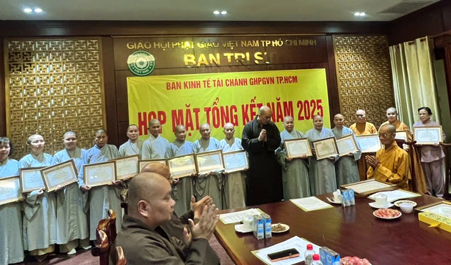 Dịp này, Ban Thường trực Ban Trị sự GHPGVN TP.HCM cũng tặng Bằng tuyên dương công đức đến tập thể Ban Kinh tế - Tài chính và Bằng công đức đến các thành viên đã tích cực đóng góp hoạt động Phật sự năm 2025.