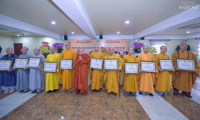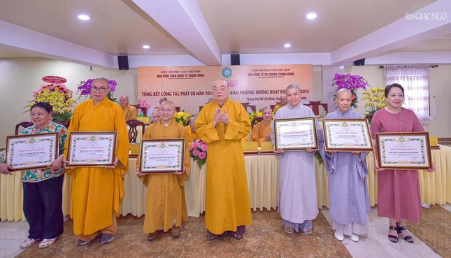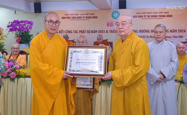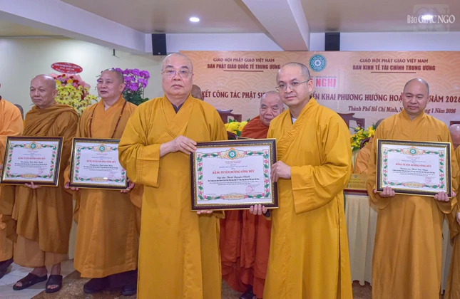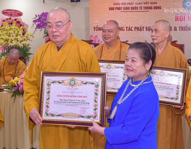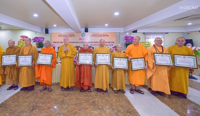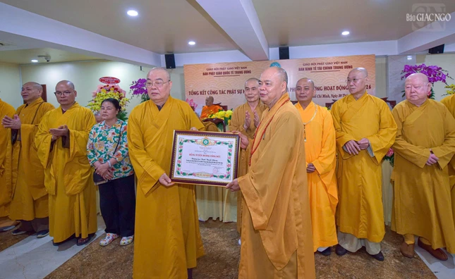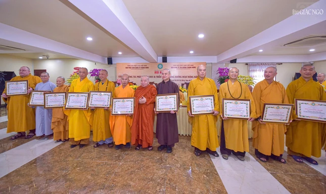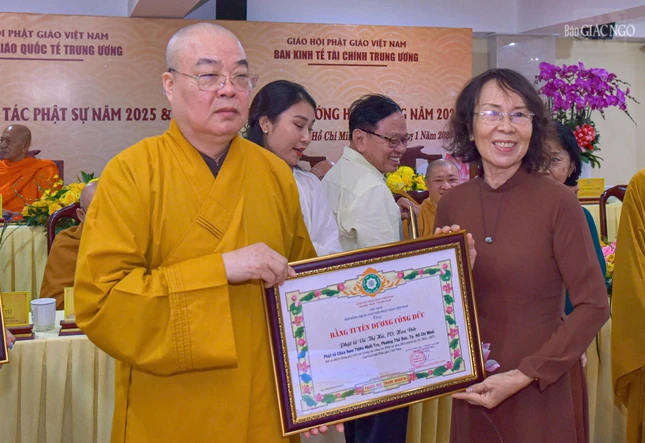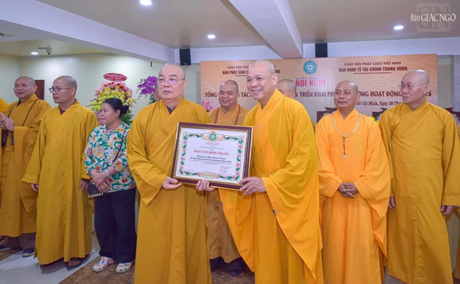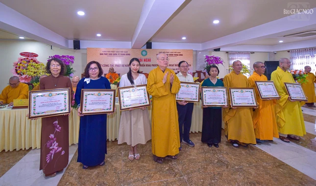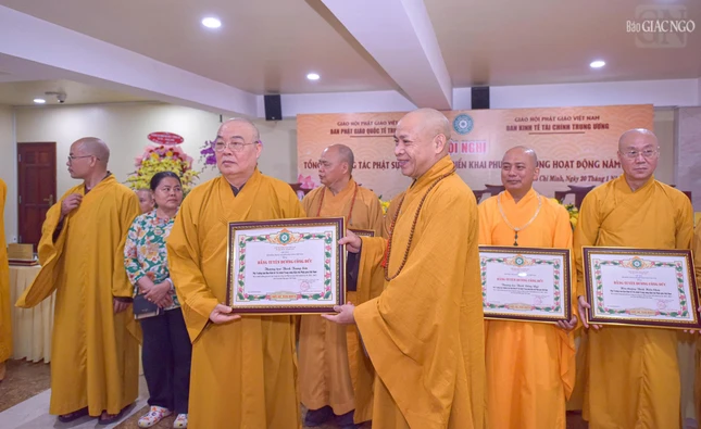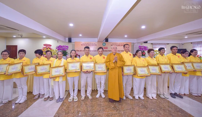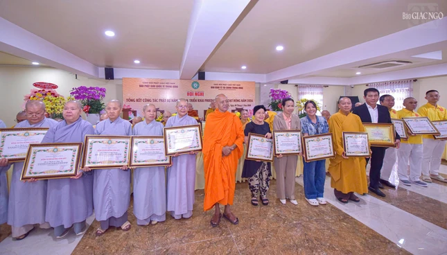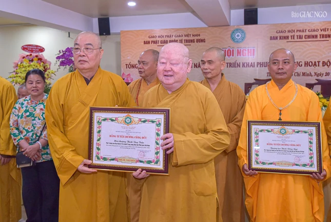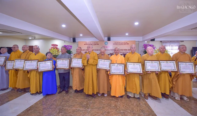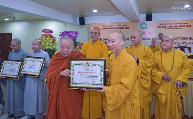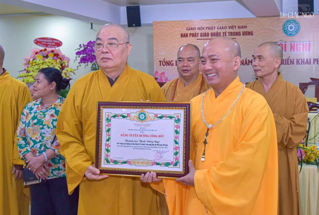 Dịp này, Ban Thường trực Hội đồng Trị sự đã trao Bằng tuyên dương công đức đến tập thể Ban Phật giáo Quốc tế T.Ư, Ban Kinh tế - Tài chính T.Ư, các đơn vị, hội, nhóm từ thiện và cá nhân là Tăng Ni, Phật tử thành viên 2 ban.