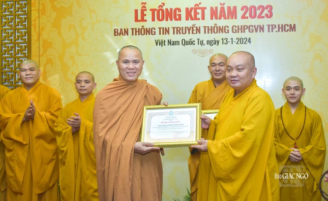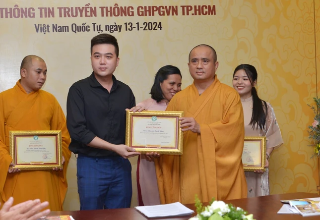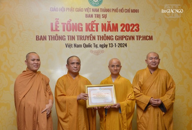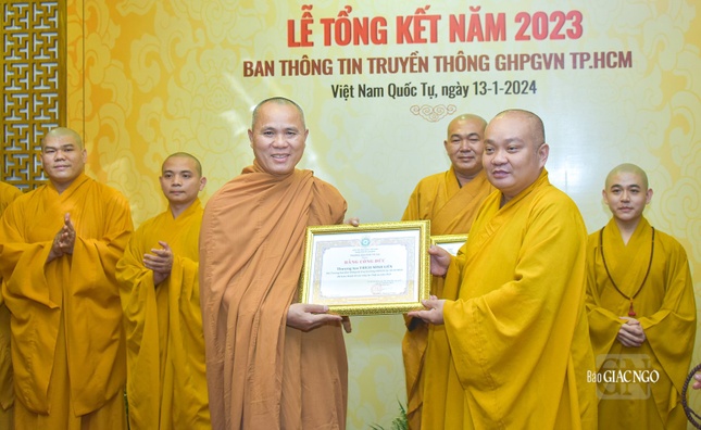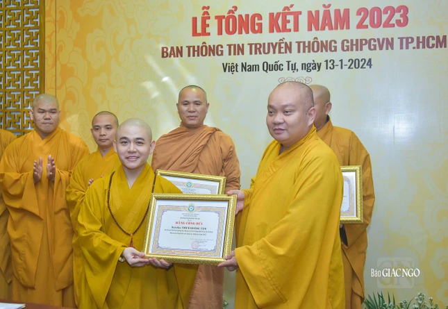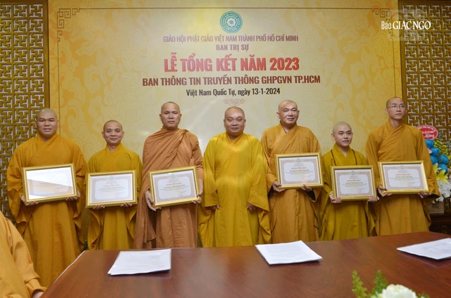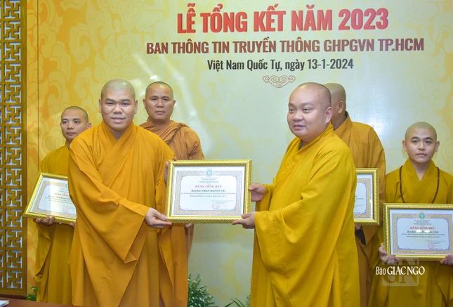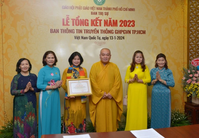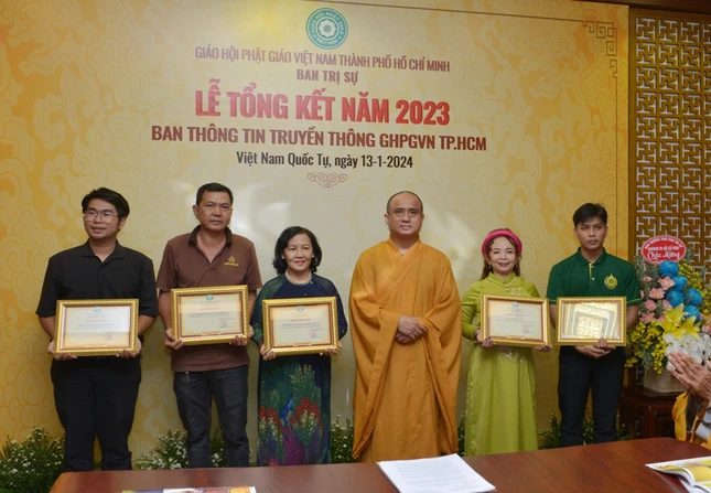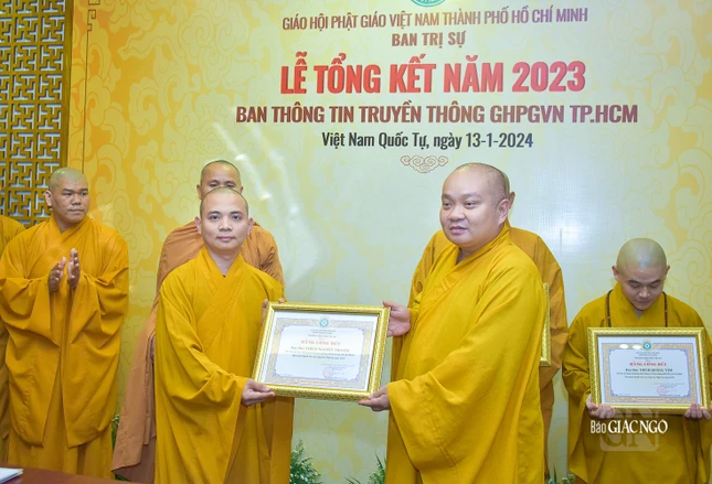 Dịp này, Ban Trị sự GHPGVN TP.HCM công bố quyết định và trao Bằng tuyên dương công đức và Bằng công đức đến 8 tập thể và cá nhân; Ban Thông tin - Truyền thông tặng Bằng công đức đến 5 tập thể trực thuộc và 7 cá nhân.