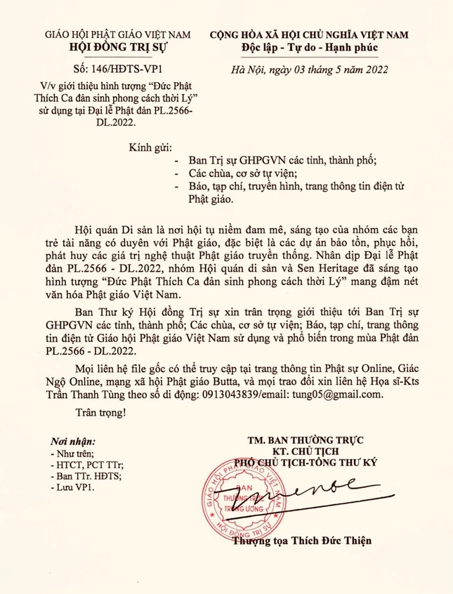 “Hội quán Di sản là nơi hội tụ niềm đam mê, sáng tạo của nhóm các bạn trẻ tài năng có duyên với Phật giáo, đặc biệt là các dự án bảo tồn, phục hồi, phát huy các giá trị nghệ thuật Phật giáo truyền thống. Nhân dịp Đại lễ Phật đản PL.2566 - DL.2022, nhóm Hội quán di sản và Sen Heritage đã sáng tạo hình tượng “Đức Phật Thích Ca đản sinh phong cách thời Lý” mang đậm nét văn hóa Phật giáo Việt Nam”, công văn do Thượng tọa Thích Đức Thiện ký có nội dung.