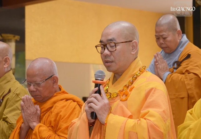 Hòa thượng Thích Huệ Trí, Phó Chủ tịch Hội đồng Trị sự, Trưởng ban Trị sự GHPGVN tỉnh Bà Rịa - Vũng Tàu đại diện các phái đoàn Ban Trị sự tỉnh nhà cùng các tỉnh Bình Dương, Đồng Nai và Hậu Giang tác bạch khánh tuế lên Đức Pháp chủ.