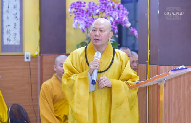 Phát biểu khai mạc, Thượng tọa Thích Minh Bảo tuyên bố khai giảng khóa An cư kiết hạ Phật lịch 2568 - Dương lịch 2024 do Ban Trị sự GHPGVN Q.4 tổ chức tại chùa Long Bửu.