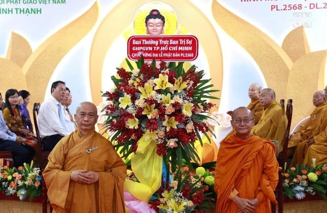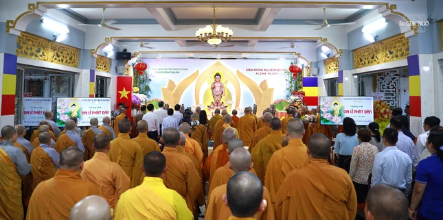 Sau nghi thức chào Quốc kỳ, Đạo kỳ và phút tưởng niệm, toàn thể đại chúng lắng lòng nghe Hòa thượng Thích Minh Giác tuyên đọc Thông điệp Đại lễ Phật đản Phật lịch 2568 của Đức Pháp chủ GHPGVN gửi đến toàn thể Tăng Ni, Phật tử.