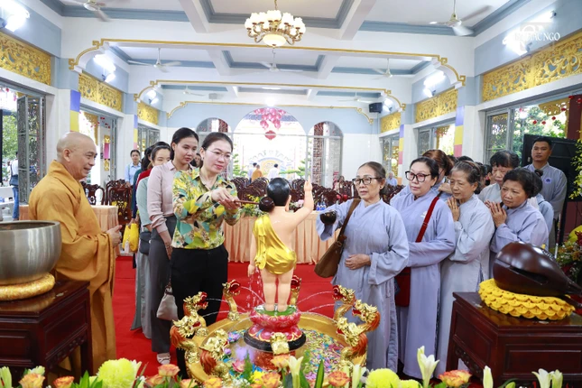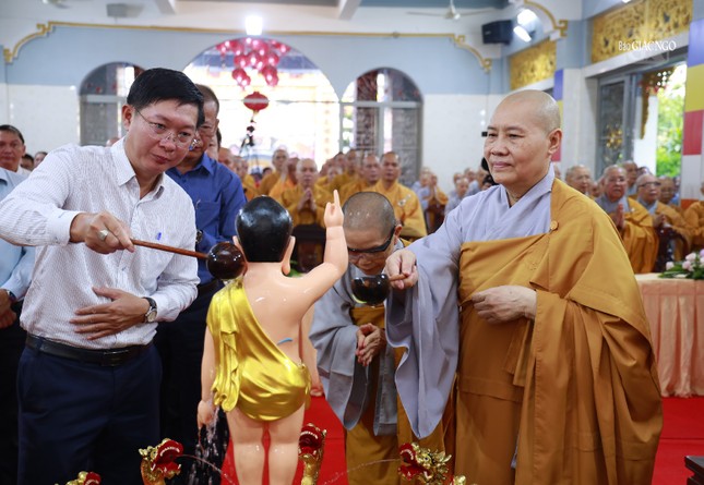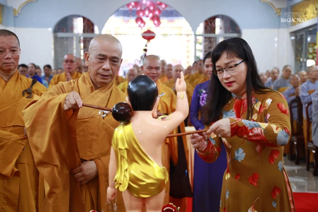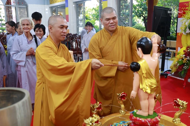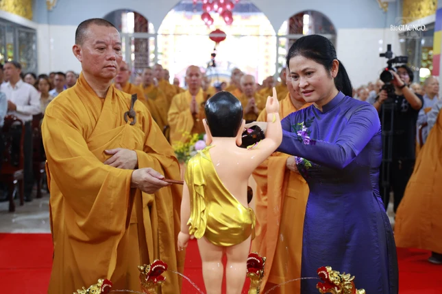 Tiếp đến, chư tôn giáo phẩm đã thành kính niêm hương, bạch Phật, đồng tụng sám Khánh đản, thực hiện nghi thức Tắm Phật truyền thống nhằm thể hiện lòng tôn kính dâng lên cúng dường Đức Thế Tôn nhân đản sinh của Ngài.