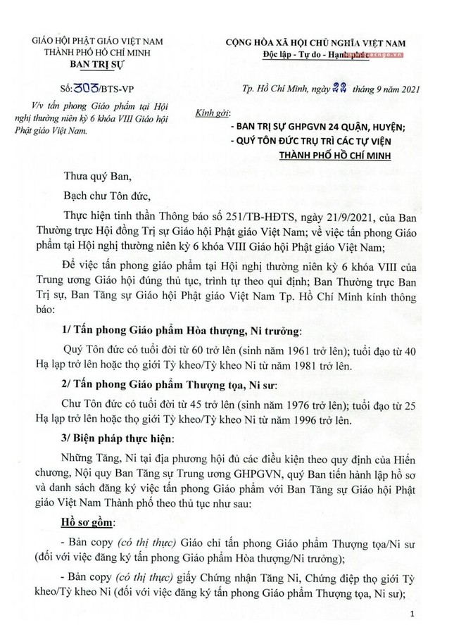 Những Tăng, Ni tại địa phương hội đủ các điều kiện theo quy định của Hiến chương, Nội quy Ban Tăng sự Trung ương GHPGVN, quý Ban tiến hành lập hồ sơ và danh sách đăng ký việc tấn phong giáo phẩm với Ban Tăng sự GHPGVN TP.HCM.
