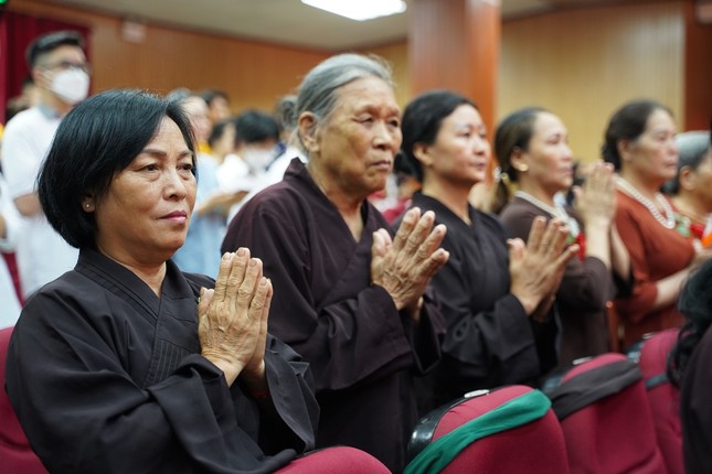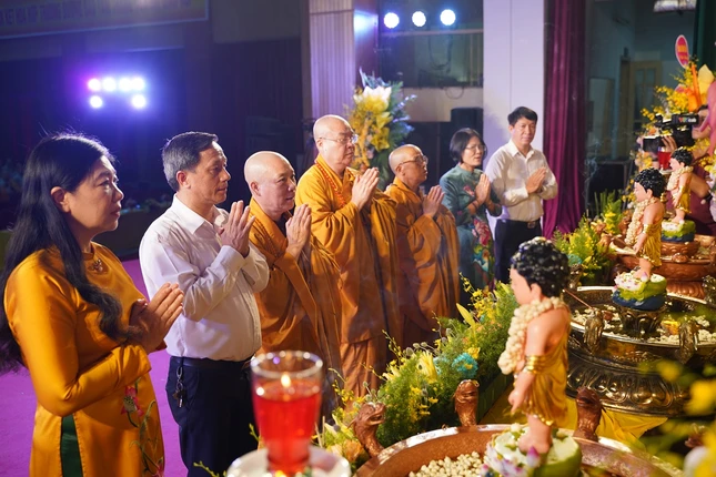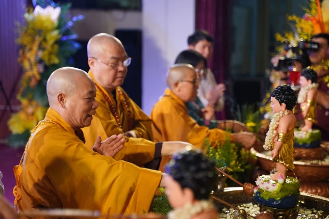 Sau lời phát biểu cảm tạ của Thượng tọa Thích Chiếu Tuệ, Phó Trưởng ban Trị sự Phật giáo TP, chư tôn đức cùng toàn thể đại chúng đã thực hiện nghi thức niêm hương, tụng kinh Chuyển Pháp luân và cử hành nghi thức Mộc dục trong tiếng niệm Phật âm vang trầm hùng.