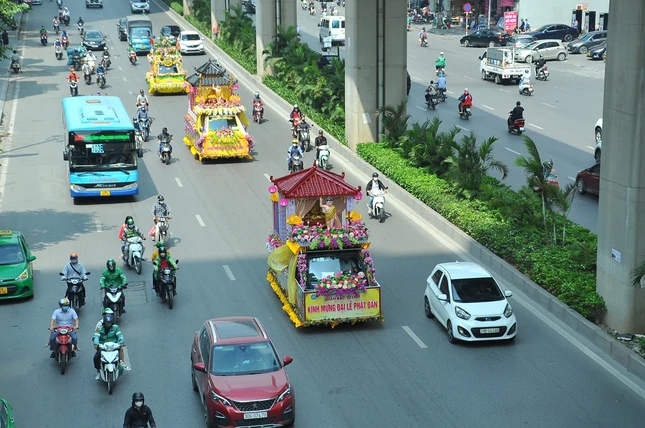 Sau khi kết thúc chương trình, các xe hoa đại diện cho 30 đơn vị Phật giáo quận, huyện, thị xã đã diễu hành lên trụ sở T.ƯGH - chùa Quán Sứ để chuẩn bị cho chương trình Đại lễ Phật đản chính thức của TƯGH diễn ra vào sáng nay 15-4 ÂL.