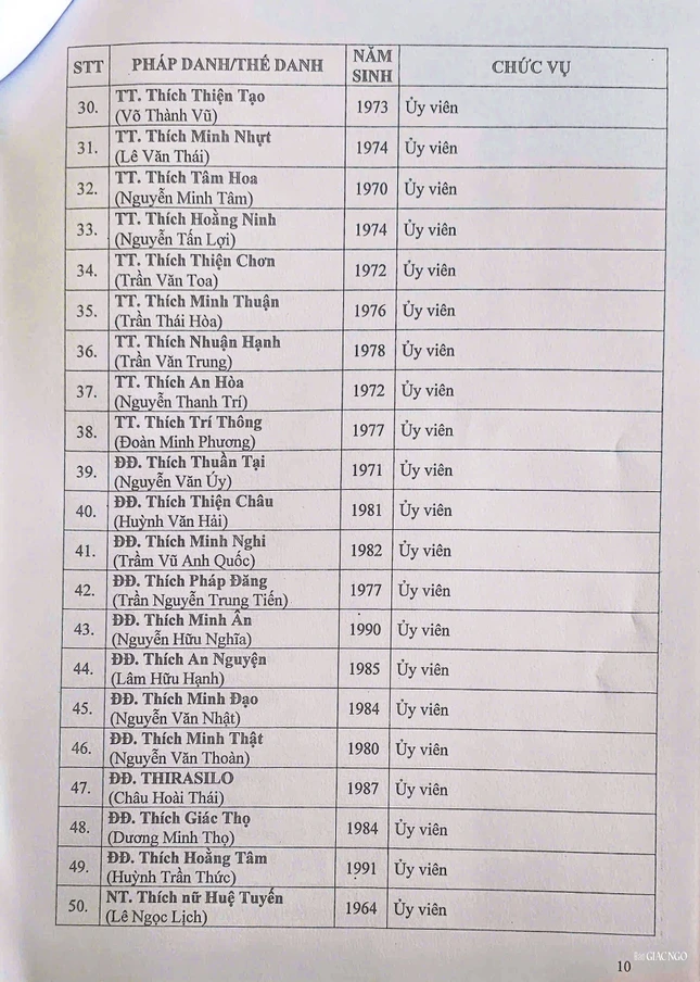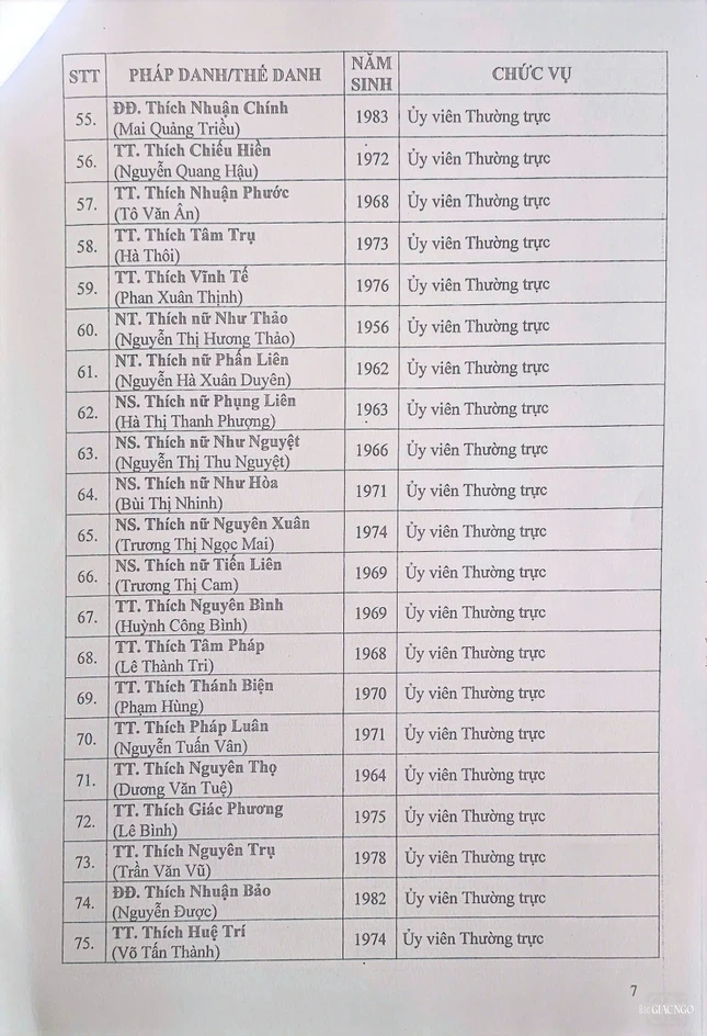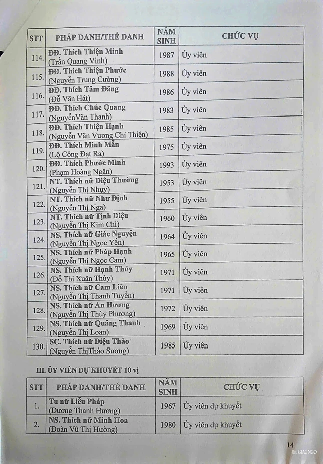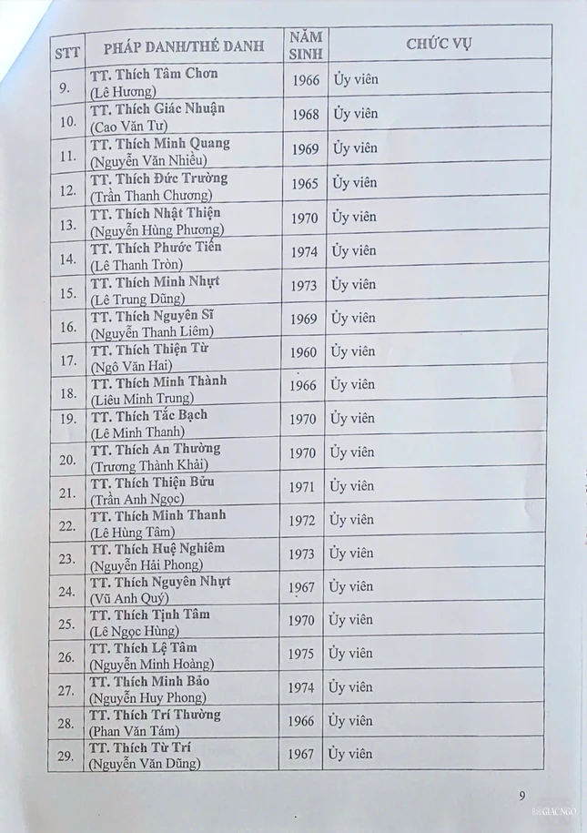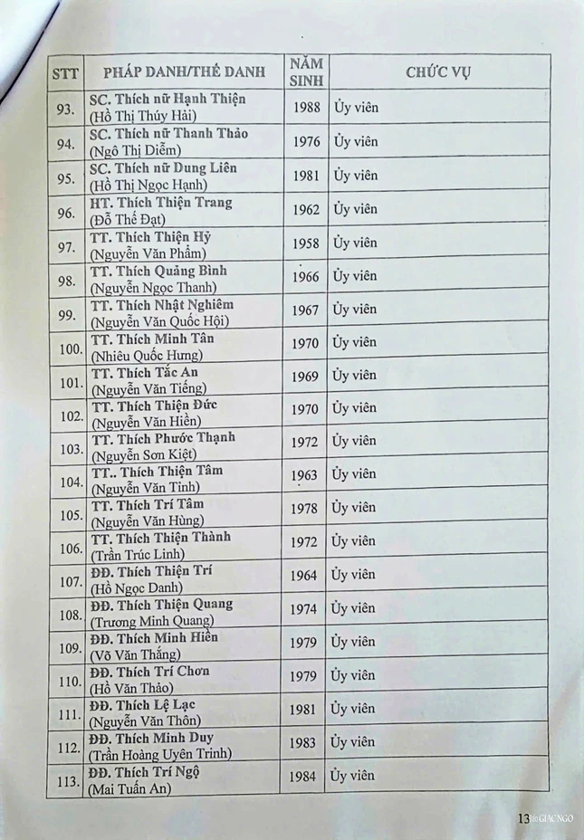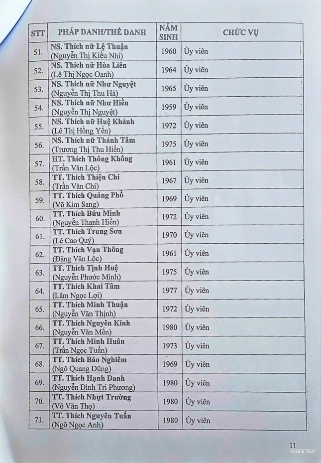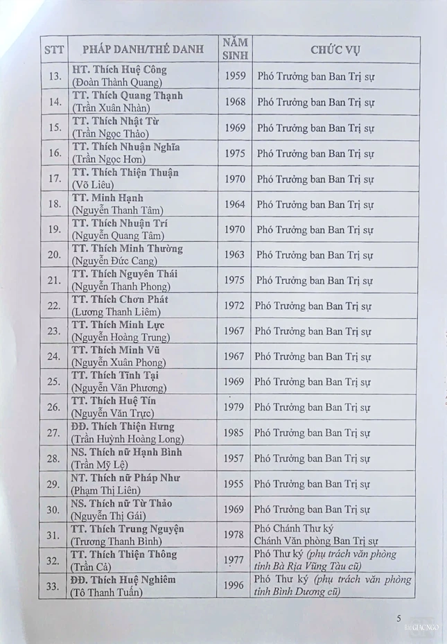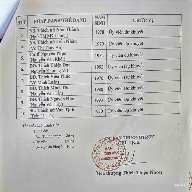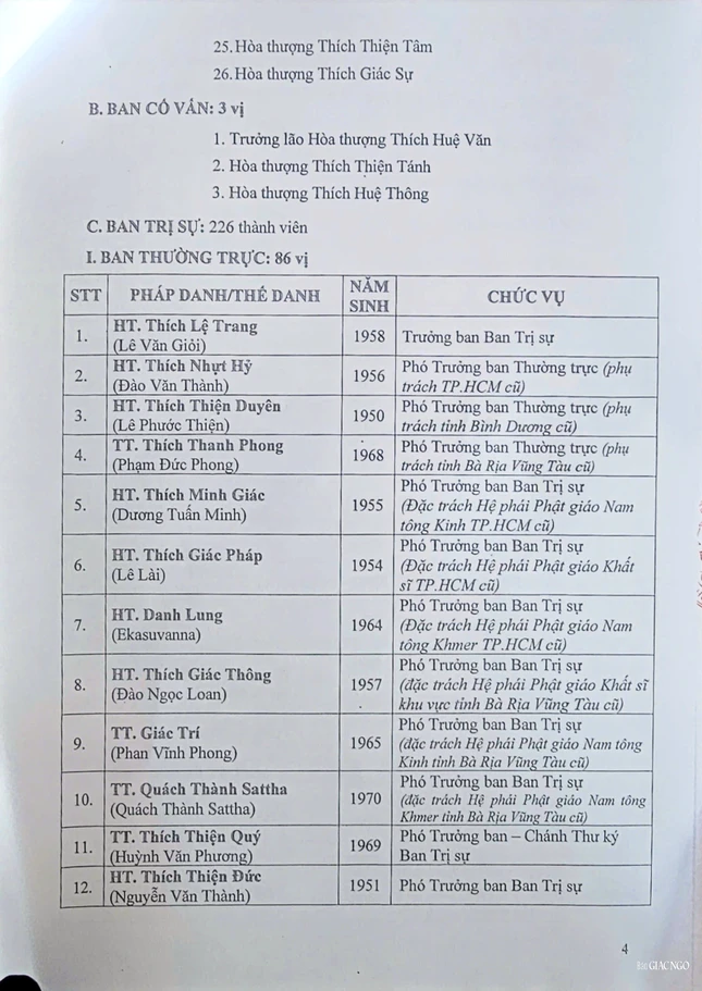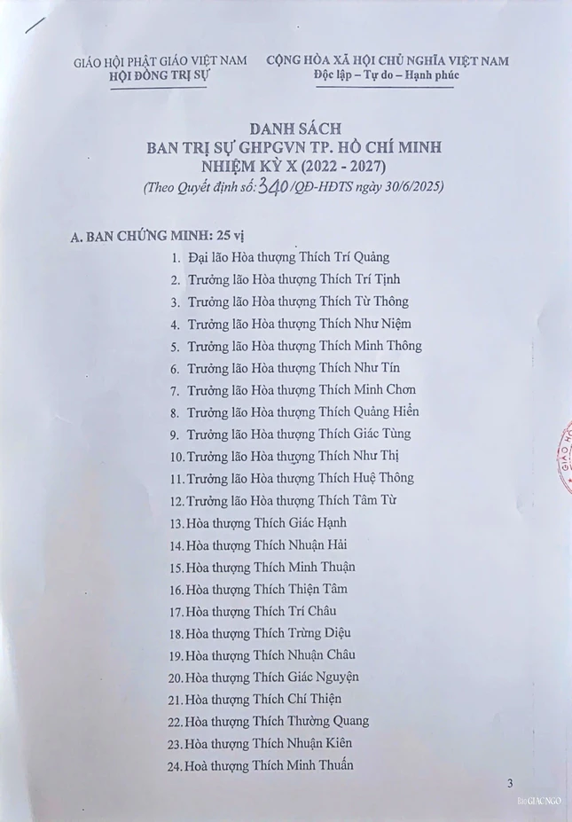 Theo đó, Quyết định chuẩn y nhân sự Ban Trị sự GHPGVN TP.HCM (mới) khóa X, nhiệm kỳ 2022-2027 gồm có Ban Chứng minh gồm 26 vị; Ban Cố vấn gồm 3 vị.