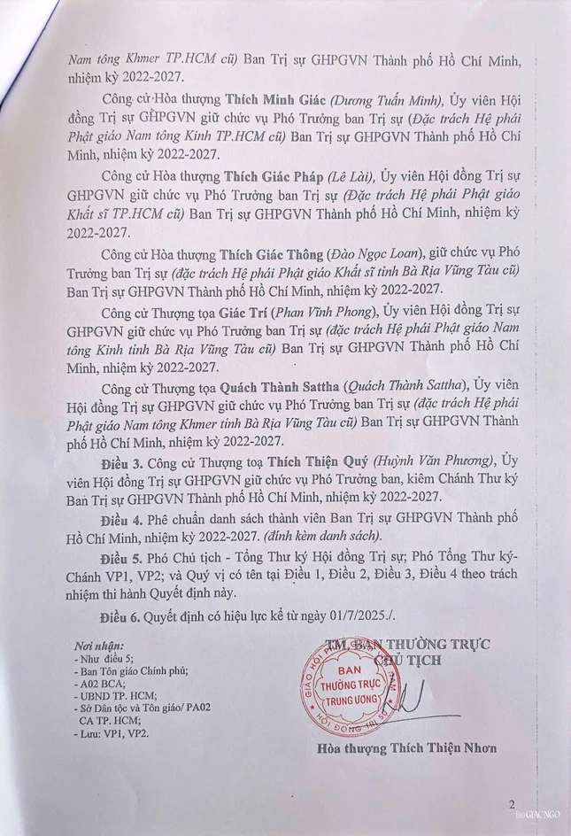 GNO - Theo đó, Trưởng lão Hòa thượng Thích Thiện Nhơn, Chủ tịch Hội đồng Trị sự GHPGVN, ngày 30-6-2025, đã ấn ký quyết định chuẩn y thành phần nhân sự của Ban Trị sự GHPGVN TP.HCM (mới) nhiệm kỳ 2022-2027 sau khi sáp nhập, hợp nhất với tỉnh Bình Dương và Bà Rịa - Vũng Tàu.