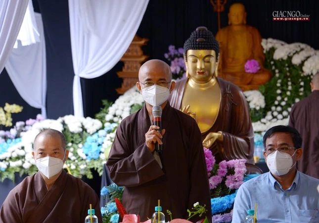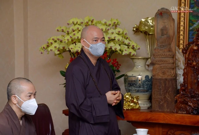 Thượng tọa Thích Thiện Quý thay mặt đoàn chuyển lời thăm hỏi, sách tấn của Trưởng lão Hòa thượng Thích Trí Quảng đến Thượng tọa Thích Thanh Phong, chư Tăng Ni và Phật tử đang thực hiện công tác thiện nguyện tại chùa Vĩnh Nghiêm, đồng thời ghi nhận những đóng góp thiết thực của chùa Vĩnh Nghiêm đối với các chương trình TTXH, đặc biệt trong công tác phòng, chống dịch Covid-19, ảnh hưởng lên mọi hoạt động của đời sống xã hội.