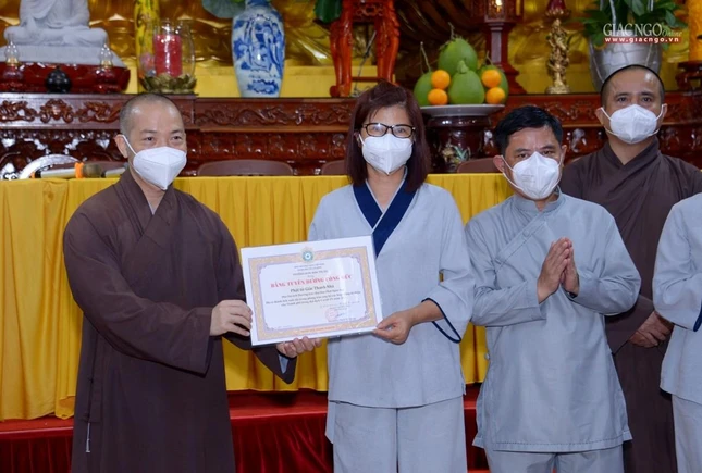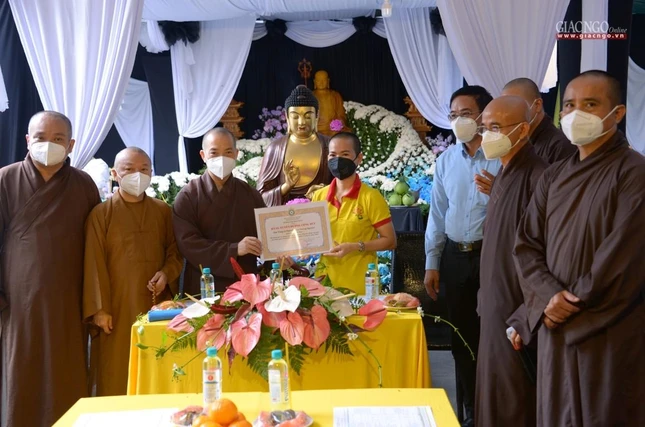 Dịp này, chư tôn đức cũng đã thay mặt Ban Thường trực Ban Trị sự GHPGVN TP.HCM trao Bằng Tuyên dương công đức và Bằng Công đức do Trưởng lão Hòa thượng Thích Trí Quảng ấn ký, tặng tịnh tài 20 triệu đồng đến mỗi cơ sở.