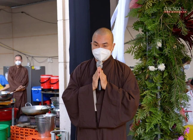 Thượng tọa Thích Thiện Quý phát biểu tại cơ sở bếp dã chiến chùa Tường Nguyên |