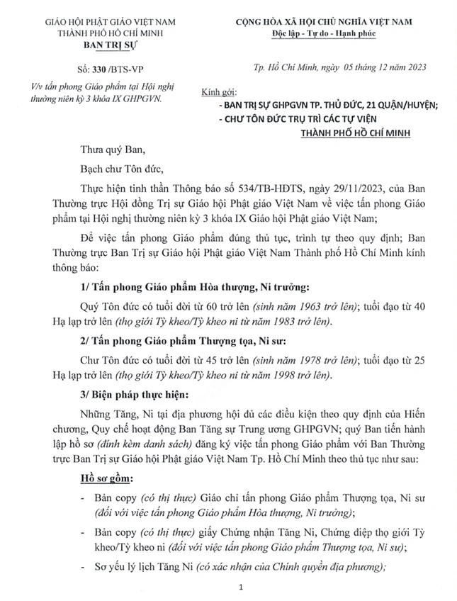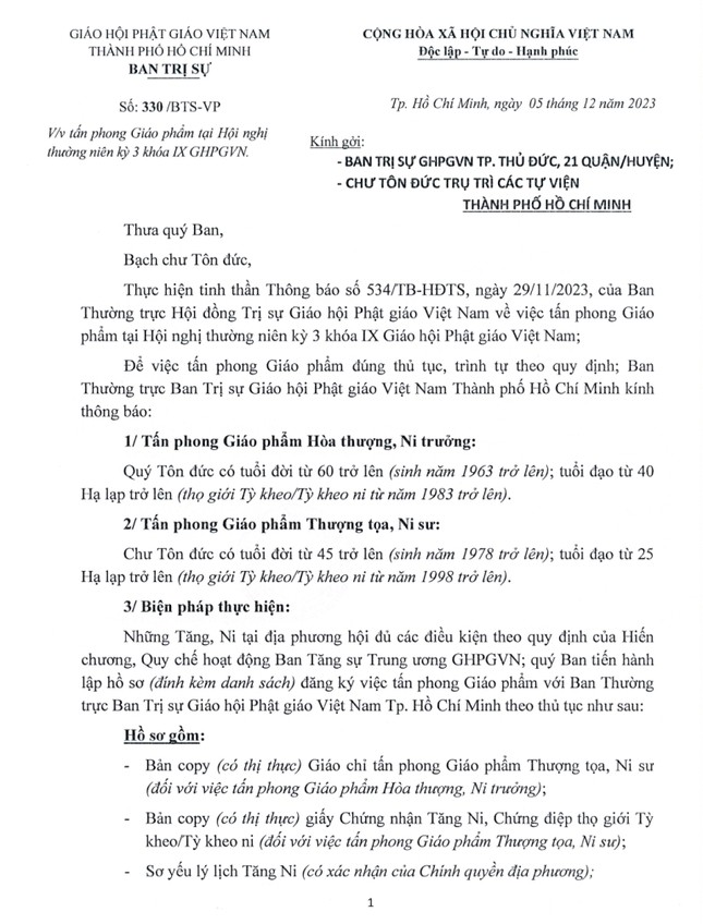 Thông báo gởi đến Ban Trị sự GHPGVN TP.Thủ Đức, 21 quận huyện; chư tôn đức trụ trì các tự viện TP.HCM, để việc tấn phong giáo phẩm đúng thủ tục, trình tự đúng theo quy định, Ban Thường trực Ban Trị sự GHPGVN TP.HCM phổ biến thông báo cụ thể theo nội dung bên dưới: