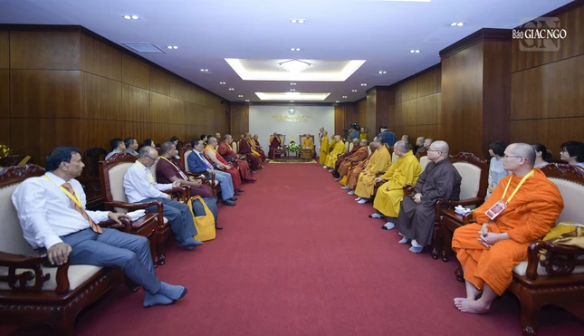 Thay mặt Ban Thường trực, Hòa thượng Thích Lệ Trang, Trưởng ban Trị sự GHPGVN TP.HCM phát biểu chào mừng chư Tăng, cư sĩ trong phái đoàn Ban Thư ký ABCP. Hòa thượng có lời thăm hỏi sức khỏe và cho biết đây là vinh dự đón tiếp phái đoàn đến thăm Ban Trị sự GHPGVN TP.HCM tại Việt Nam Quốc Tự, tìm hiểu về Phật giáo TP.HCM.