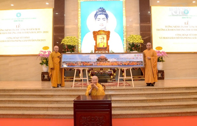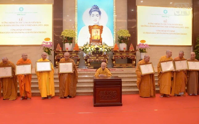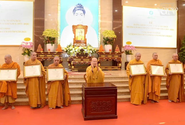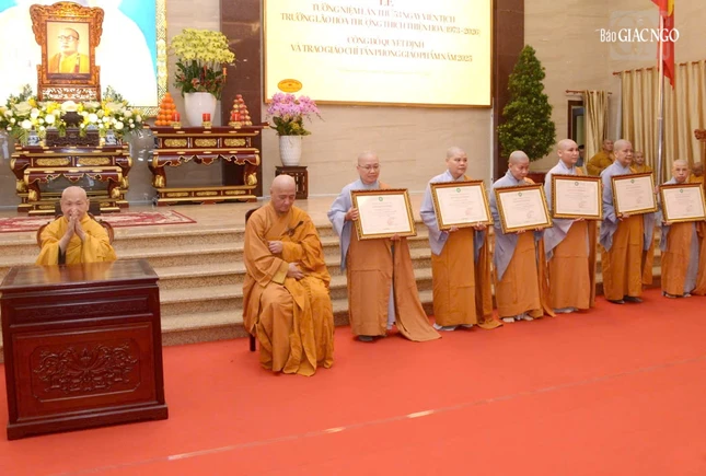 Tại buổi lễ, Thượng tọa Thích Giác Dũng, Ủy viên Hội đồng Trị sự, Thư ký Văn phòng Hội đồng Chứng minh, Thư ký Ban Giám luật thuộc Hội đồng Chứng minh công bố quyết định trao Giáo chỉ tấn phong giáo phẩm của Ban Thường trực Hội đồng Chứng minh GHPGVN ngày 30-12-2025.