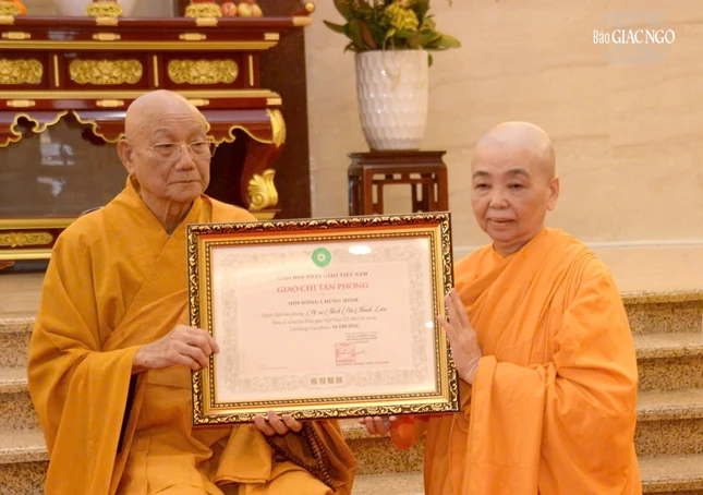 Ban Tổ chức cung thỉnh Trưởng lão Hòa thượng Thích Thiện Nhơn, Phó Pháp chủ Hội đồng Chứng minh, Chủ tịch Hội đồng Trị sự; Trưởng lão Hòa thượng Thích Minh Thông, Phó Thư ký Ban Thường trực Hội đồng Chứng minh; cùng chư vị Phó Chủ tịch Hội đồng Trị sự trao Giáo chỉ tấn phong đến 196 vị Tăng, Ni vừa được tấn phong giáo phẩm trong đợt này.