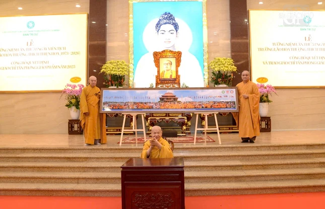 Dịp này, Ban Thông tin - Truyền thông GHPGVN TP.HCM trao tặng tấm ảnh đại biểu tham dự Đại lễ Vesak Liên Hiệp Quốc 2025 đến Ban Trị sự GHPGVN TP.HCM.