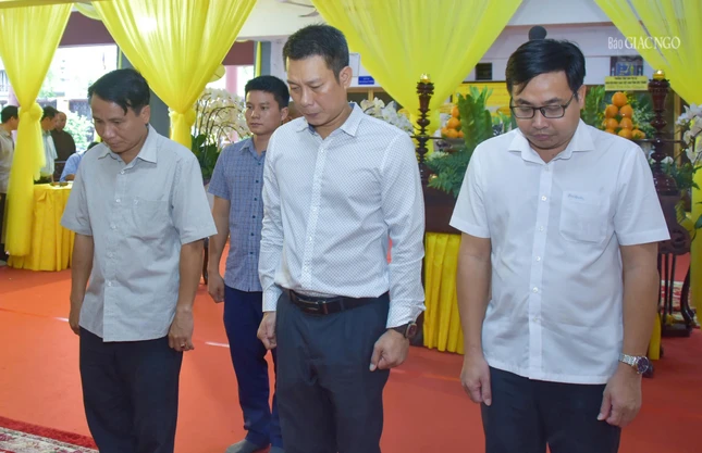 | Đoàn đại diện Tỉnh ủy, HĐND, UBND, UBMTTQVN tỉnh BR-VT do ông Đặng Minh Thông, Ủy viên Ban Thường vụ Tỉnh ủy, Phó Chủ tịch UBND tỉnh làm trưởng đoàn mặc niệm trước Giác linh đài Hòa thượng Thích Huệ Trí |