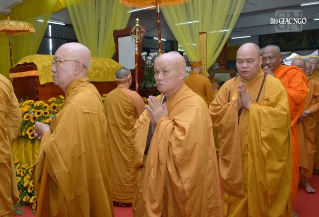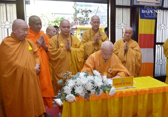 Chư tôn đức thành kính thọ tâm tang, hữu nhiễu kim quan và đại diện các phái đoàn ghi sổ tang lưu niệm, phân ưu cùng Ban Tổ chức lễ tang, môn đồ gia quyến và Ban Quản trị chùa Phật Học Xá Lợi.