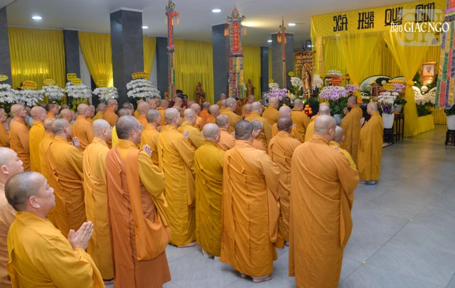 Trong niềm kính tiếc vị giáo phẩm có những đóng góp to lớn đối với sự phát triển của Phật giáo TP.HCM hơn 40 năm qua, chư tôn đức hữu nhiễu kim quan và ghi sổ tang lưu niệm.