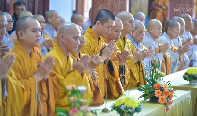 Dịp này, Ban Trị sự GHPGVN Q.1 cũng tổ chức Đại lễ Vu lan - Báo hiếu Phật lịch 2568 tại tổ đình Vạn Thọ. Phật tử thực hiện nghi thức cài hoa hồng cho chư Tăng và dâng pháp y cúng dường trong tiếng tụng kinh Vu lan của chư Tăng, Ni.