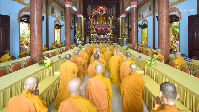 Trước chánh điện, Trưởng lão Hòa thượng Thích Thanh Hùng niêm hương bạch Phật, đại chúng trì tụng kinh theo nghi thức thiền môn và thực hiện các nghi thức mãn hạ.