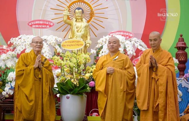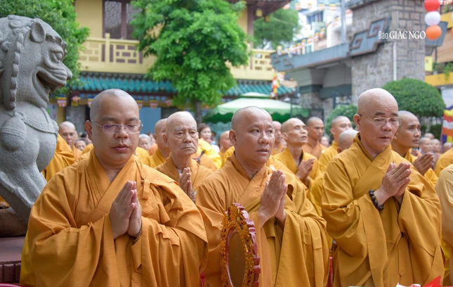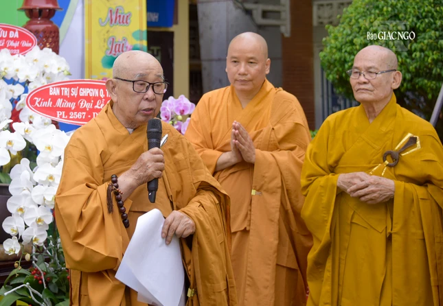 Sau nghi thức đạo kỳ, đạo ca, toàn thể đại chúng trang nghiêm lắng nghe Trưởng lão Hòa thượng Thích Như Tín tuyên đọc Thông điệp Đại lễ Phật đản Phật lịch 2567 của Đức Pháp chủ GHPGVN đến toàn thể Tăng Ni, Phật tử.