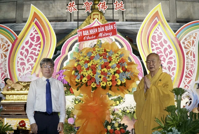 Dịp này, Ban Trị sự GHPGVN Q.5 đón nhận nhiều lẵng hoa và nhiều phần quà Kính mừng Đại lễ Phật đản được các cơ quan chức năng, chính quyền sở tại trao tặng.