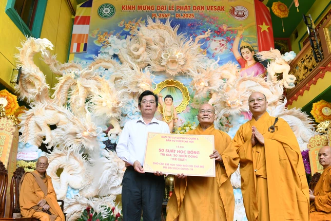 Dịp này, Ban Trị sự GHPGVN Q.6 trao tặng 50 suất học bổng cho học sinh có nhiều nỗ lực vượt khó, học sinh mồ côi do ba mẹ qua đời trong dịch Covid-19.