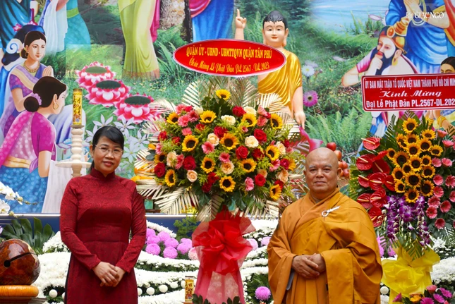 Phát biểu tại buổi lễ, bà Nguyễn Thị Chiên, Chủ tịch Ủy ban MTTQVN Q.Tân Phú chúc sức khỏe và chúc mừng Phật đản an lạc đến chư tôn đức Tăng Ni, Phật tử.