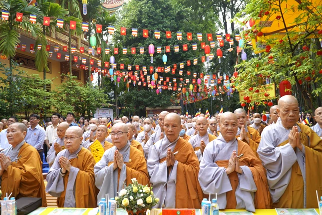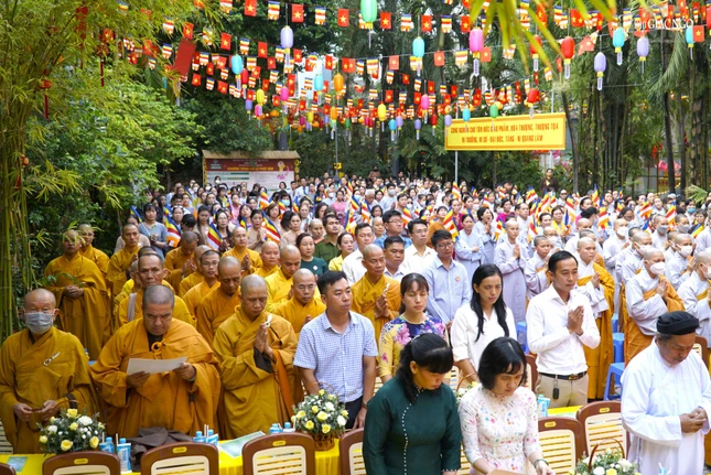 Sau nghi thức chào Quốc kỳ, Đạo kỳ, nhập từ bi quán, toàn thể đại chúng lắng lòng nghe Hòa thượng Thích Thiện Hòa, Trưởng ban Trị sự Phật giáo Q.Tân Phú tuyên đọc Thông điệp Đại lễ Phật đản Phật lịch 2567 của Đức Pháp chủ GHPGVN.