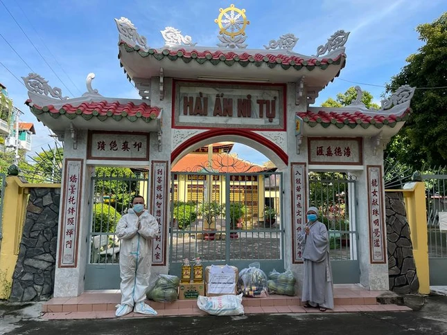 Do chùa nằm trong khu vực phong tỏa, Ni sư Thích nữ Như Thiền, trụ trì chùa Hương Nghiêm ra đầu hẻm nhận cúng dường của Ban Trị sự Phật giáo quận |