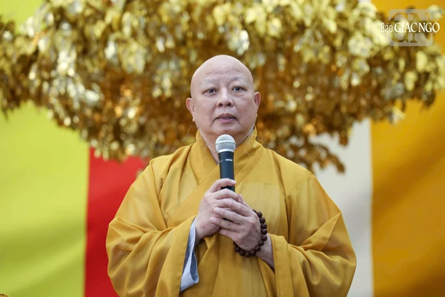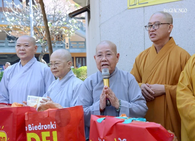 Tại buổi trao quà ở Việt Nam Quốc Tự và chùa Phổ Quang, Hòa thượng Thích Lệ Trang, Phó Chủ tịch Hội đồng Trị sự, Trưởng ban Trị sự GHPGVN TP.HCM, Trưởng ban Quản trị Việt Nam Quốc Tự, Trưởng ban Quản trị chùa Phổ Quang thăm hỏi sức khỏe và chúc bà con đón Tết cổ truyền an vui, đầm ấm.