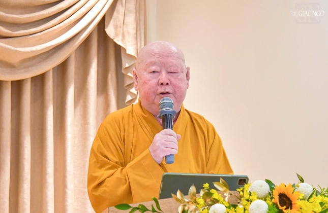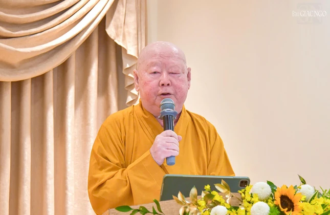 Hòa thượng Thích Chơn Tịnh thay mặt Ban Tổ chức phát biểu cảm tạ khép lại hội nghị tổng kết Phật sự năm 2025 của Ban Từ thiện xã hội Báo Giác Ngộ.