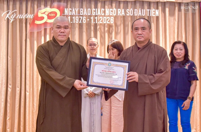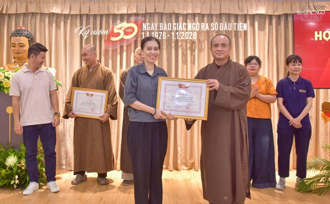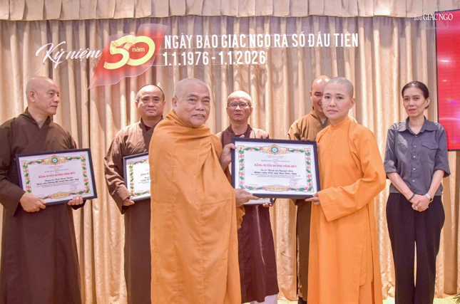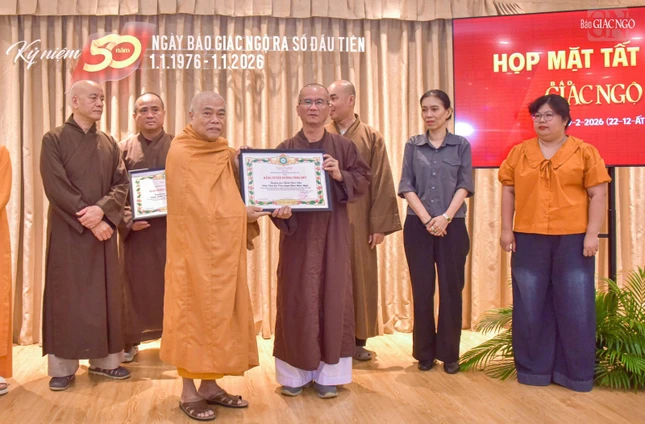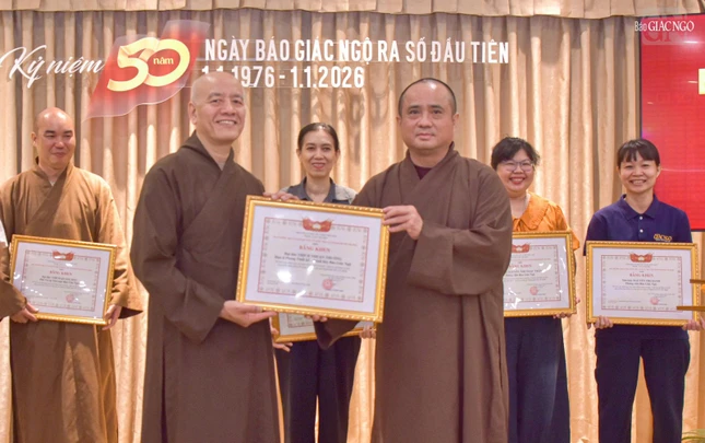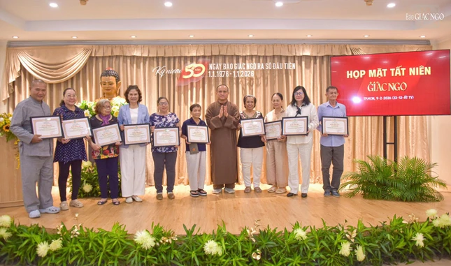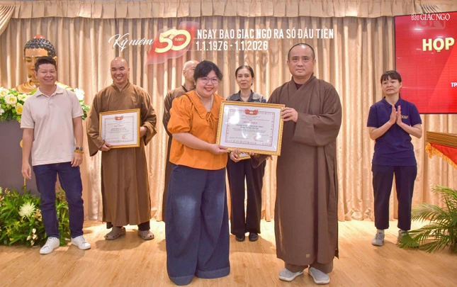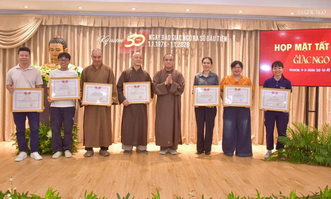 Dịp này, Ban Biên tập trao Giấy khen của Trưởng ban Tôn giáo Chính phủ - Bộ Dân tộc và Tôn giáo; Bằng khen của UBMTTQVN TP.HCM; Bằng tuyên dương công đức của Ban Thường trực Hội đồng Trị sự; Bằng công đức của Ban Thường trực Ban Trị sự GHPGVN TP.HCM đến các cá nhân, ghi nhận những đóng góp cho Báo Giác Ngộ trong năm qua.