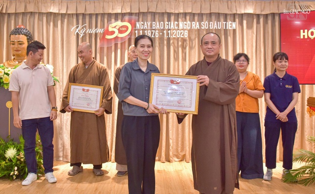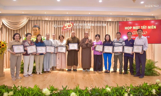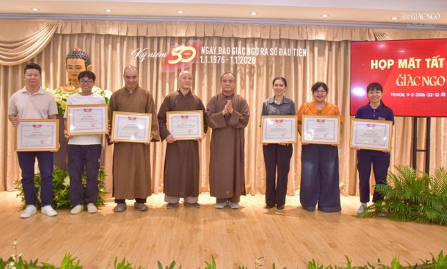Dịp này, Ban Biên tập trao Giấy khen của Trưởng ban Tôn giáo Chính phủ, Bộ Dân tộc và Tôn giáo; Bằng khen của UBMTTQVN TP.HCM; Bằng tuyên dương công đức của Ban Thường trực Hội đồng Trị sự; Bằng công đức của Ban Thường trực Ban Trị sự GHPGVN TP.HCM đến các cá nhân, ghi nhận những đóng góp cho Báo Giác Ngộ trong năm qua.