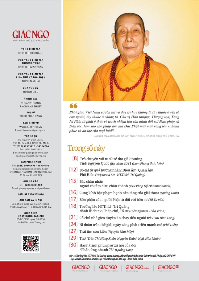 - Mục Phật học, có đăng phần tiếp theo bài "Bồ-tát từ quả hướng nhân: Diệu Âm, Quan Âm, Phổ Hiền" do Hòa thượng Thích Trí Quảng giảng tại chùa Huê Nghiêm; "Bậc chân nhân người có tâm đức, chơn chánh" của TKN. Pháp Hỷ - Dhammananda.
