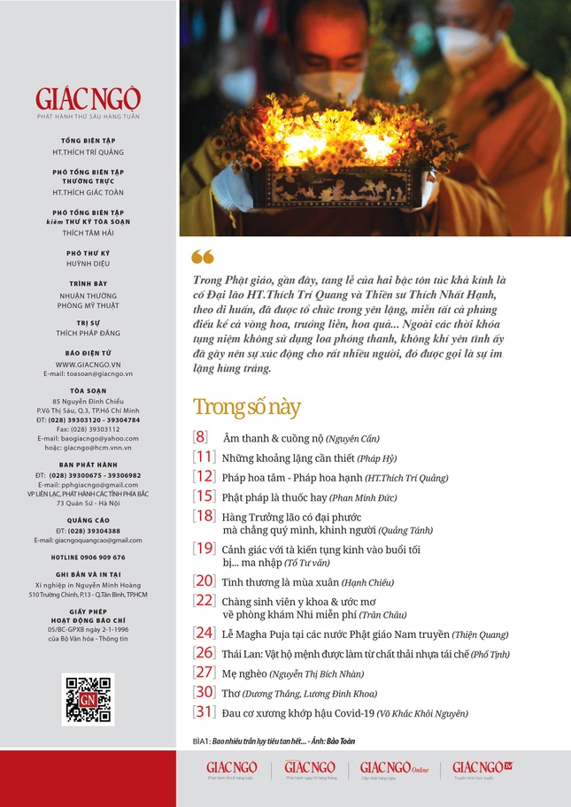 - Các chuyên mục khác: "Lễ Magha Puja tại các nước Phật giáo Nam truyền" (Thiện Quang tổng hợp); "Thái Lan: Vật hộ mệnh được làm từ chất thải nhựa tái chế" (Phổ Tịnh tổng hợp); Truyện ngắn "Mẹ nghèo" (Nguyễn Thị Bích Nhàn); "Đau cơ xương khớp hậu Covid-19" (Bác sĩ Võ Khắc Khôi Nguyên...