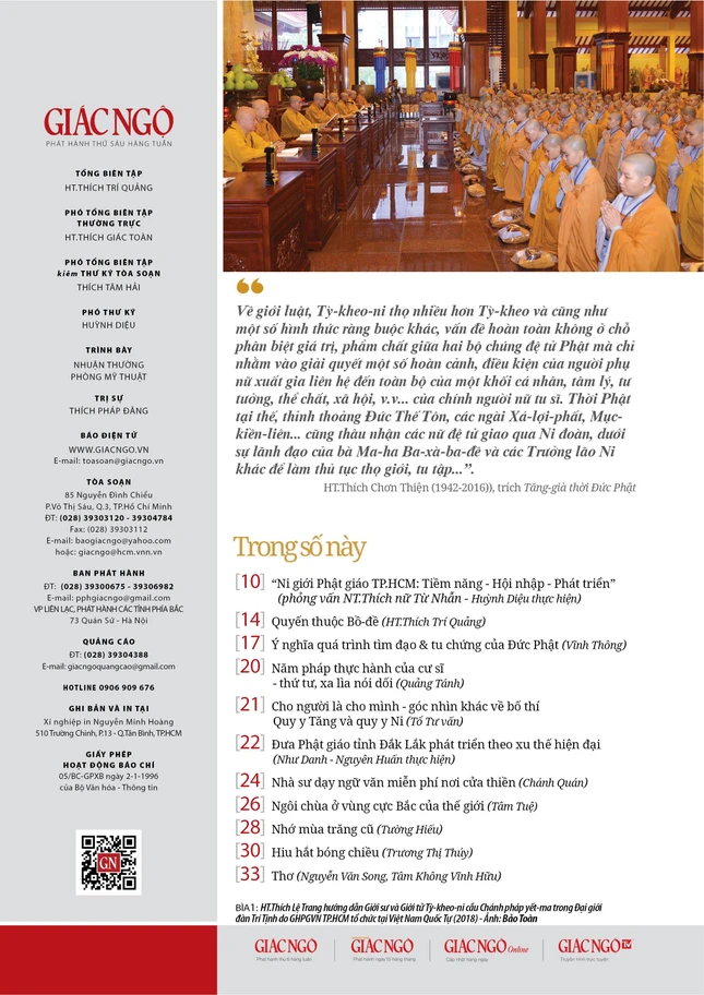 - Trong mục Tư vấn, chia sẻ cùng bạn đọc các vấn đề: "Quy y Tăng và quy y Ni"; "Cho người là cho mình - góc nhìn khác về bố thí".