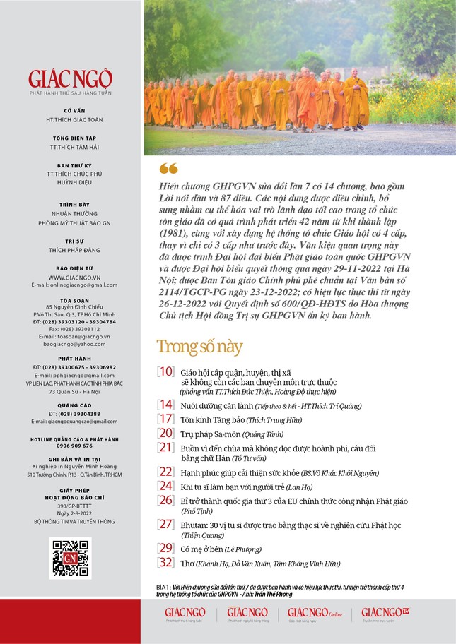 - Mục Phật học: Trân trọng giới thiệu cùng bạn đọc phần tiếp theo bài giảng "Nuôi dưỡng căn lành" của Trưởng lão Hòa thượng Thích Trí Quảng; "Tôn kính Tăng bảo" (Thích Trung Hữu)