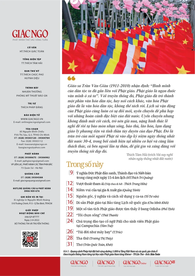 Mục Phật học: có đăng "Ý nghĩa Đức Phật đản sanh, Thành đạo và Niết-bàn trong cùng một ngày 15-4 âm lịch" của Hòa thượng Thích Trí Quảng; phần tiếp theo bài "Vượt thoát tham ái" (Thích Trung Hữu).