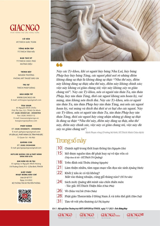 - Mục Phật học: đăng phần tiếp theo bài giảng "Mở được nguồn tâm để phát huy sự vô tận vốn có" của Trưởng lão Hòa thượng Thích Trí Quảng; "Trên đỉnh núi Thứu" (Hoàng Nguyên).