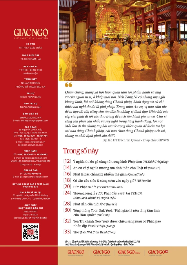 - Các chuyên mục khác: "Tổng thống Yoon Suk Yeol: 'Phật giáo là nền tảng tâm linh của Hàn Quốc'", (Phổ Tịnh tổng hợp); "Tòa Thị chính New York được chiếu sáng màu cờ Phật giáo nhân dịp Vesak" (Thiện Quang tổng hợp); Thơ của Liên Nhã, Trần Thanh Thoa...