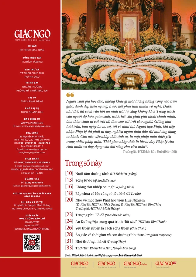 - Mục Phật học: Trân trọng giới thiệu cùng bạn đọc bài giảng "Nuôi tâm dưỡng tánh" của Đại lão Hòa thượng Thích Trí Quảng; "Sống tự do" (Diệu Liên Lý Thu Linh lược dịch).