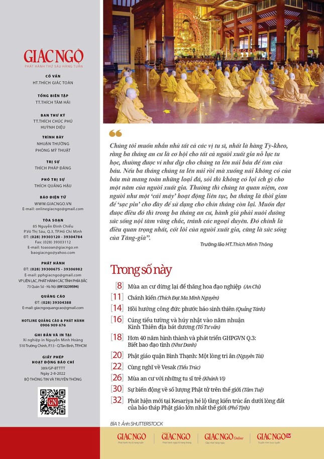 Trên chuyên mục Bạn trẻ, Báo Giác Ngộ số 1308 ra ngày 27-6 giới thiệu cùng bạn đọc những chia sẻ chân thật và đầy cảm hứng từ bốn vị Tỳ-kheo trẻ, tại trường hạ chùa Tuyền Lâm (TP.HCM) - những người đã và đang gặt hái được những lợi ích thiết thực từ mùa an cư, đồng thời gửi gắm những thông điệp sâu sắc về ý nghĩa và giá trị của truyền thống quý báu này, qua bài Mùa an cư với những tu sĩ trẻ (Khánh Vi).