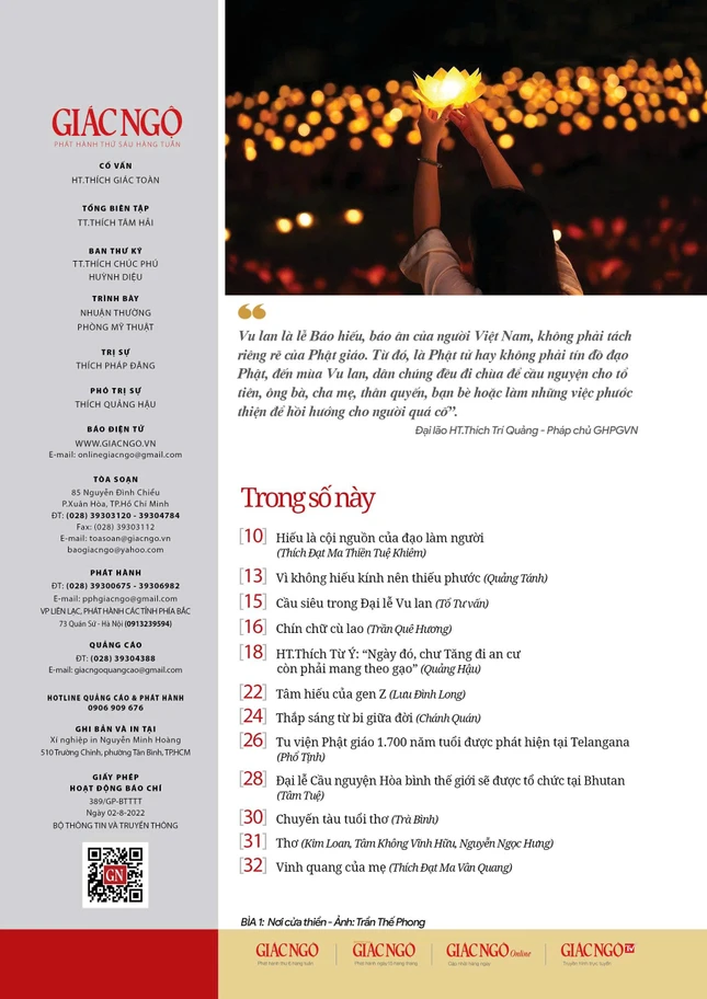 - Trên Báo Giác Ngộ số 1318 tuần này, Tổ Tư vấn sẽ ra lời bạn đọc thắc mắc xoay quanh việc Cầu siêu trong Đại lễ Vu lan.