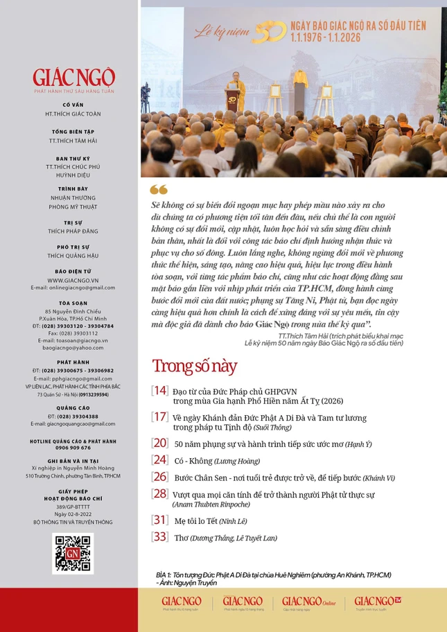 - Nhân Kỷ niệm 50 năm ngày xuất bản số báo đầu tiên (1-1-1976 – 1-1-2026), Báo Giác Ngộ đã chọn một cách kỷ niệm rất riêng: dành sự tri ân cho đời bằng việc tiếp sức cho những ước mơ đang chênh vênh nơi ngưỡng cửa giảng đường, nhà trường. Lễ trao học bổng diễn ra trong không khí ấm áp, như một dấu son trong hành trình nửa thế kỷ làm báo - một hành trình mà tinh thần phụng sự xã hội luôn song hành cùng từng trang báo. Mời bạn đọc cùng theo dõi bài 50 năm phụng sự và hành trình tiếp sức ước mơ (Hạnh Ý) được đăng trên mục Văn hóa.